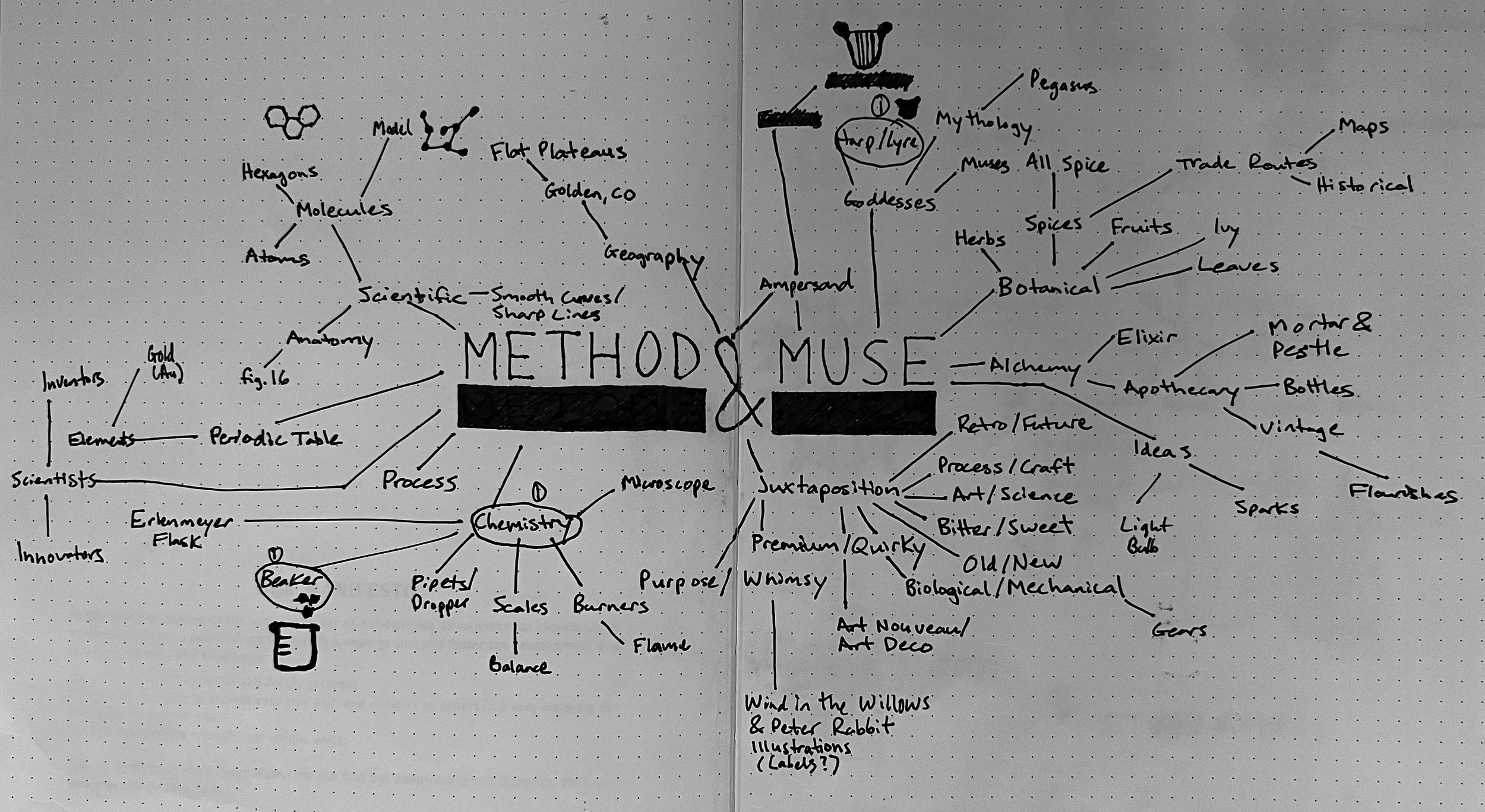 Their goal to create a brand started with the idea of juxtaposition, inspired by their philosophy of combining the science of distilling with artistic inspiration. The essence of the brand is to contrast ideas: process & craft, science & whimsy, premium & quirky. Through discovery and exploration with the client, we examined word cues and pairings that had potential to visually translate contrasting ideas: beaker & lyre, atom & flower, hexagon & botanicals.